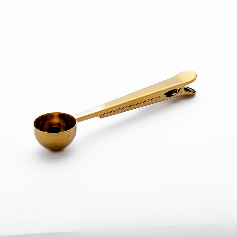 The golden coffee spoon made of stainless steel combines beauty with functionality, allowing you to scoop the perfect amount of coffee while featuring a clip to seal the bag after use. This elegant tool helps you maintain the freshness of your coffee, making each cup a special experience